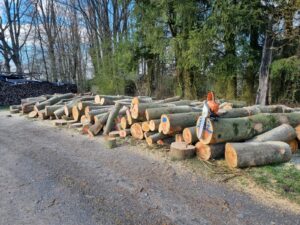 Nachdem vor einigen Tagen das Buchenholz für den 16. Bad Orber Köhlermeiler aus dem Wald antransportiert worden war, haben sich die Köhler am heutigen Samstag um 7 Uhr zur großen Spaltaktion zusammengefunden. Mit schwerem Gerät und Muskelkraft wurden die Stämme in mehrstündiger Aktion fachgerecht aufgespalten. Nun haben sie noch einige Tage Zeit abzulagern, um dann rechtzeitig zum bevorstehenden 16. Köhlerfest am 20. / 21. Juni 2026 auf der Festwiese am Hartmannsheiligen zu einem stattlichen Köhlermeiler aufgebaut zu werden.